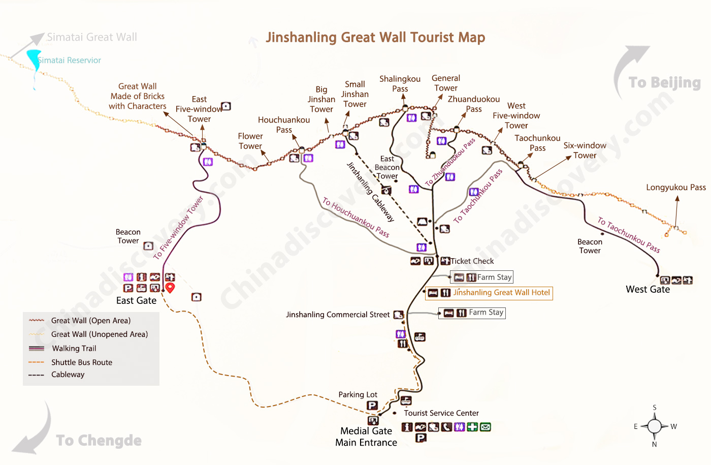 Seddin yaklaşık 650km’lik kısmı Beijing’den günü birlik ziyaret edilebilecek uzaklıkta. Ancak sadece 42 kilometrelik kısmı yürüyüş için kullanılabiliyor. 4 farklı gezi noktası bulunuyor. Simatay çok dik ve az restore edilmiş zor bir parkur. En iyi korunmuş (ya da restore edilmiş diyelim) ve en kolay parkura sahip olanı Badaling. Nerede okusam çok kalabalık olduğu yazıyordu o nedenle ben biraz daha az popüler olan ayrıca teleferik ve kızak (toboggan)ulaşımı olan ama biraz daha engebeli bir bölüm olan Mutianyu’yu seçmiştim. Kısmet epey daha eğimli, her daim yokuş yukarı yokuş aşağı durumu yaşatan Jinshanling’eymiş. 3 gündür kapalı olan Badaling ve Mutianyu’ya rağmen oldukça az insanla yürüdük sedde. Hatta sonlara doğru ara ara restore edilmemiş bölümleri tırmandık, indik, zıpladık, atladık falan 😉